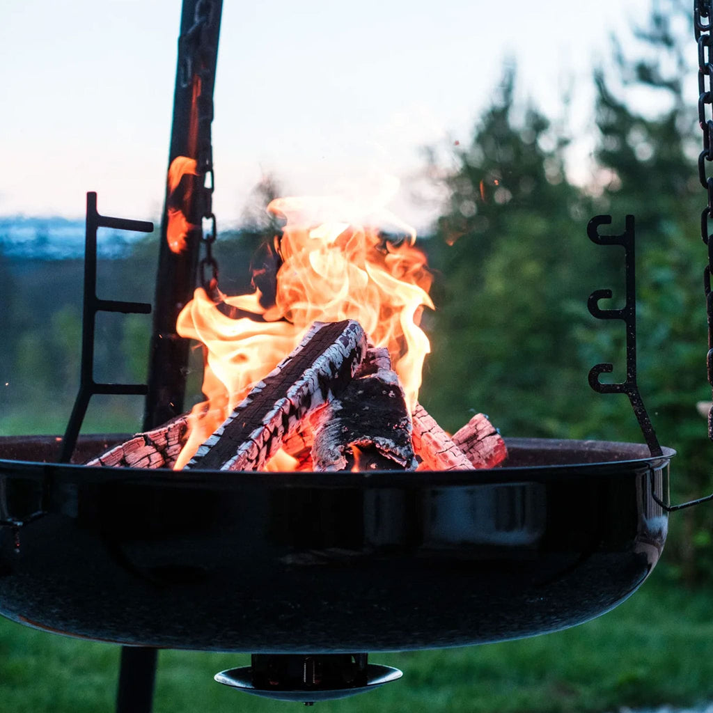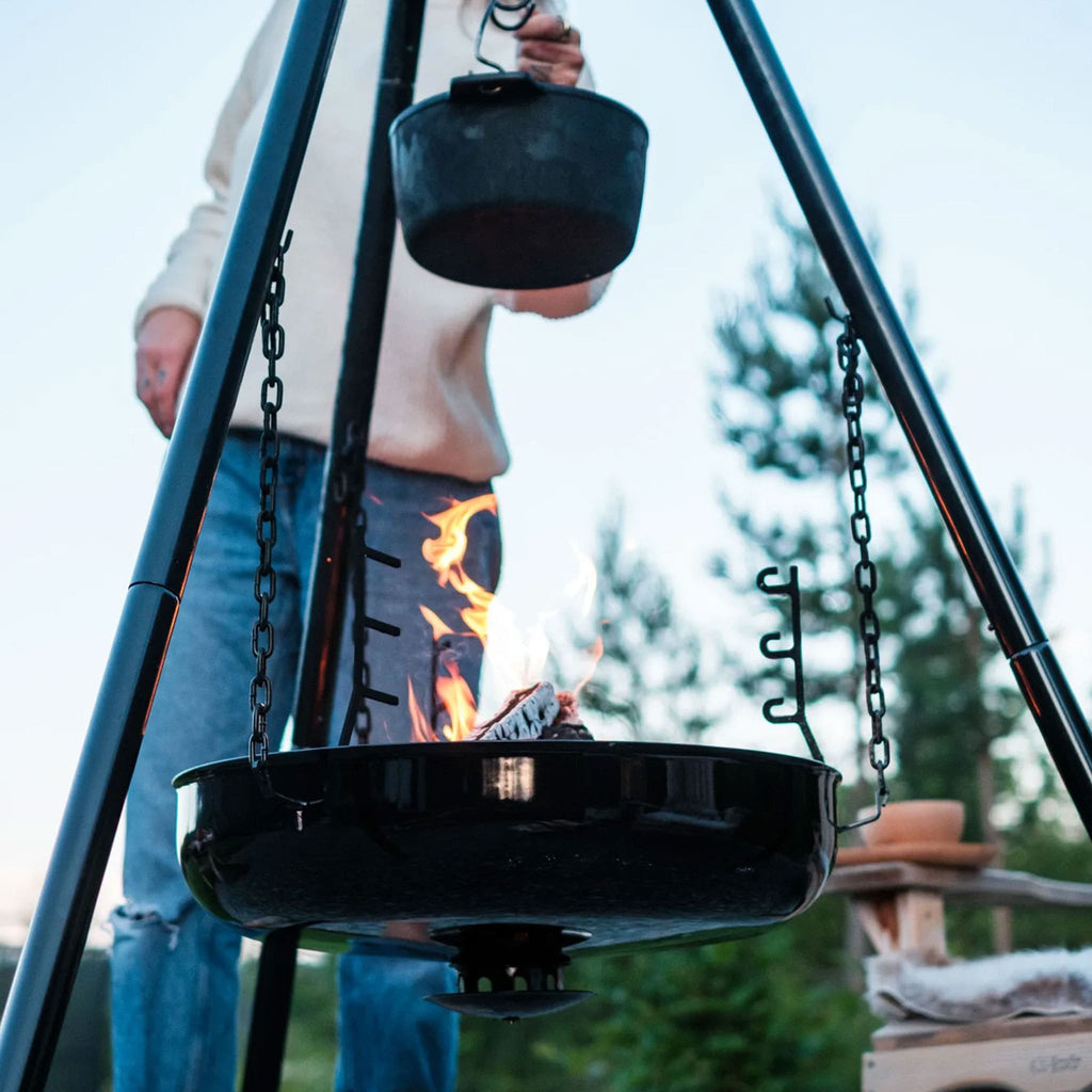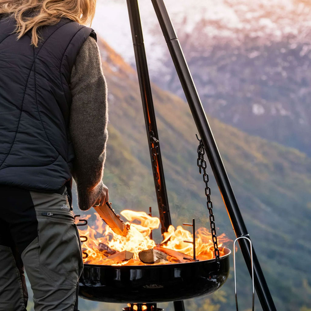 De Espegard Bålpanne Glo bestaat uit een driepoot en een stalen vuurschaal, die hangt aan drie stevige kettingen. De poten zijn eenvoudig in hoogte te verstellen, zodat je altijd maximale stabiliteit hebt op elke ondergrond.