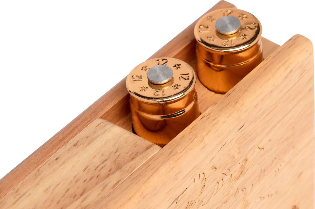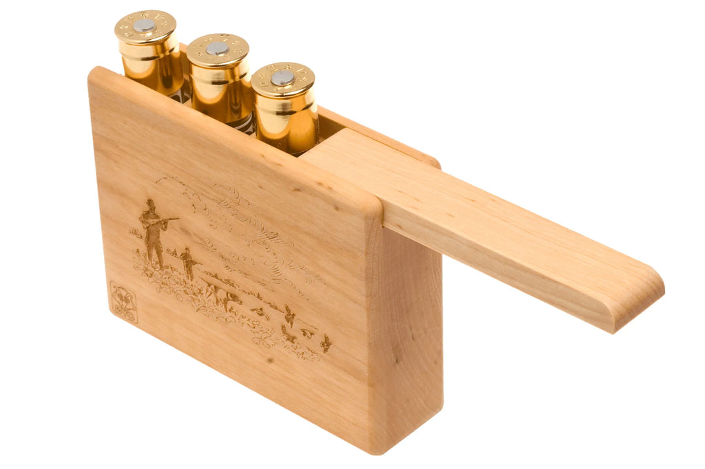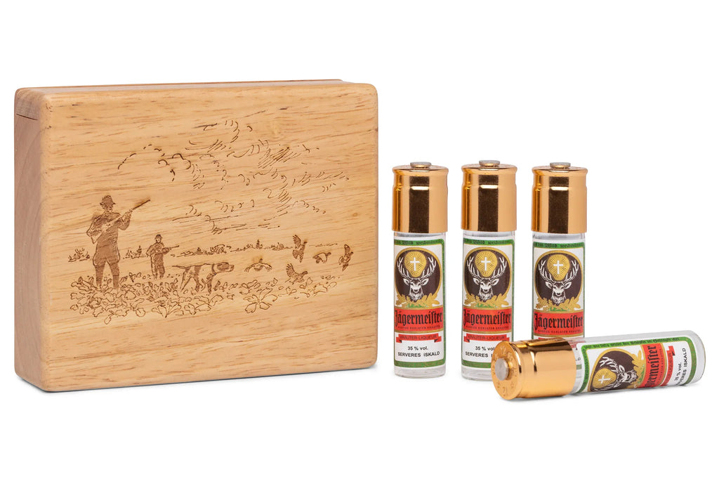Verras iedere jager of buitenliefhebber met dit stijlvolle houten borrelkistje, gevuld met vier unieke glazenhagelpatronen. De patronen kunnen eenvoudig zelf worden gevuld met een favoriete drank – ideaal voor onderweg, tijdens een jachttrip of bij een knusse borrel buiten.