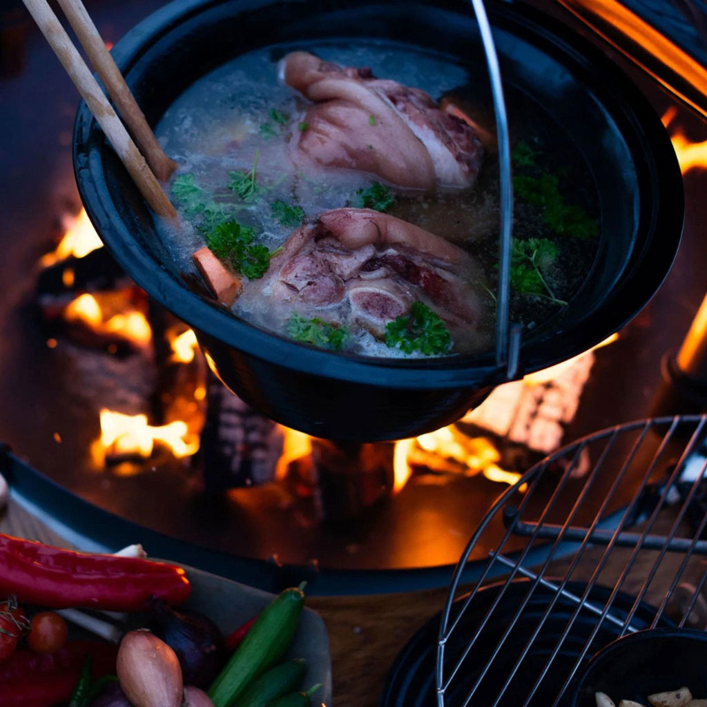 Het stevige hengsel maakt het mogelijk om de pan aan een driepoot of ketting boven het vuur te hangen. De goed sluitende deksel met houten knop houdt warmte en smaak perfect vast, zodat gerechten gelijkmatig garen en vol aroma blijven.
