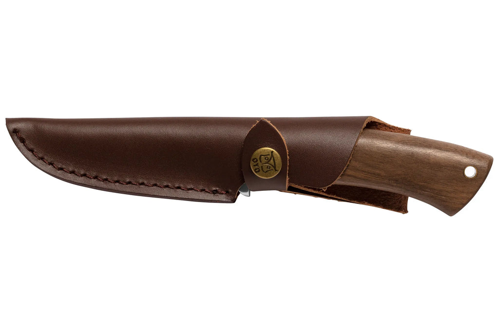 Het 13 cm lange handvat van Burma Padauk hout is ergonomisch gevormd en biedt een comfortabele grip, zelfs bij langdurig gebruik. Het Øyo Dovre jachtmes wordt geleverd in een luxe geschenkverpakking en een lederen holster, waarmee je het eenvoudig en veilig aan je riem kunt dragen.