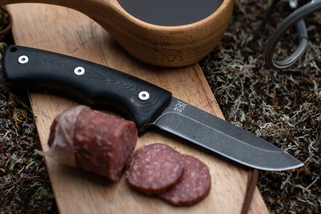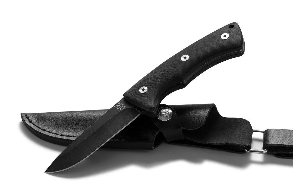 Het 10 cm lange full tang lemmet is gemaakt van geoxideerd Sandvik 12C27-staal, gehard tot 58–60 HRC, waardoor het uitzonderlijk scherp blijft en uitstekend bestand is tegen intensief gebruik. De geoxideerde afwerking biedt extra bescherming en geeft het mes zijn stoere, robuuste uitstraling.