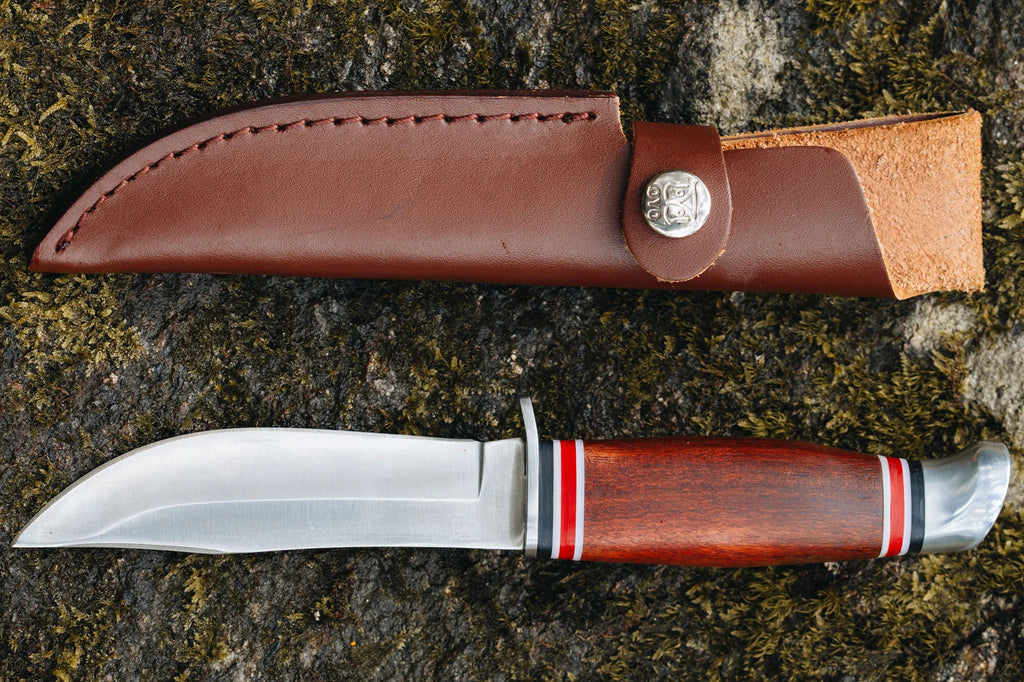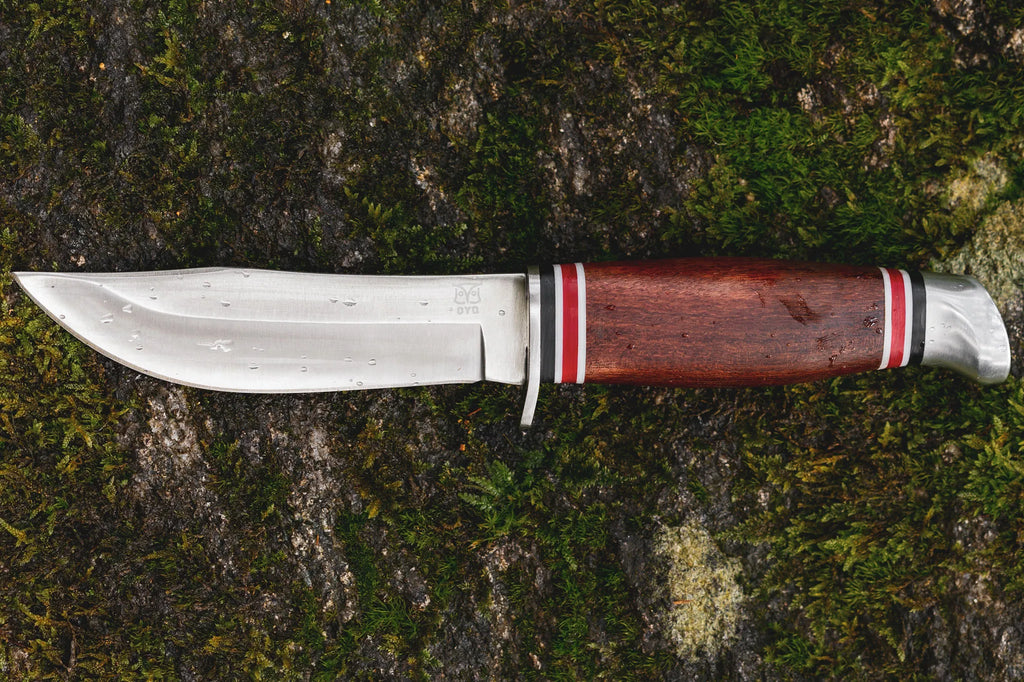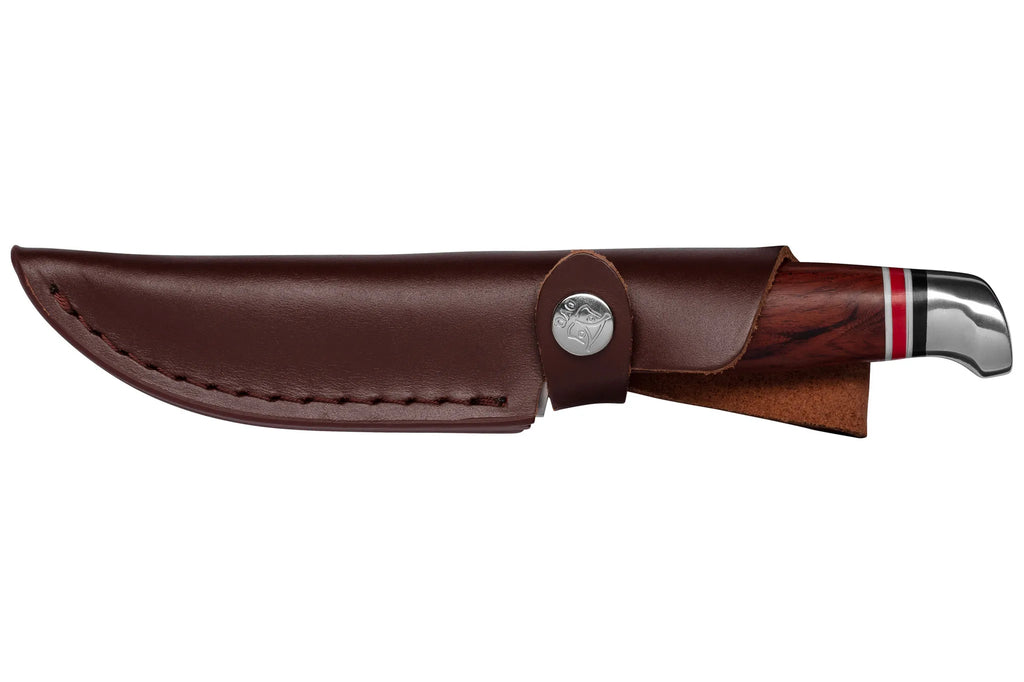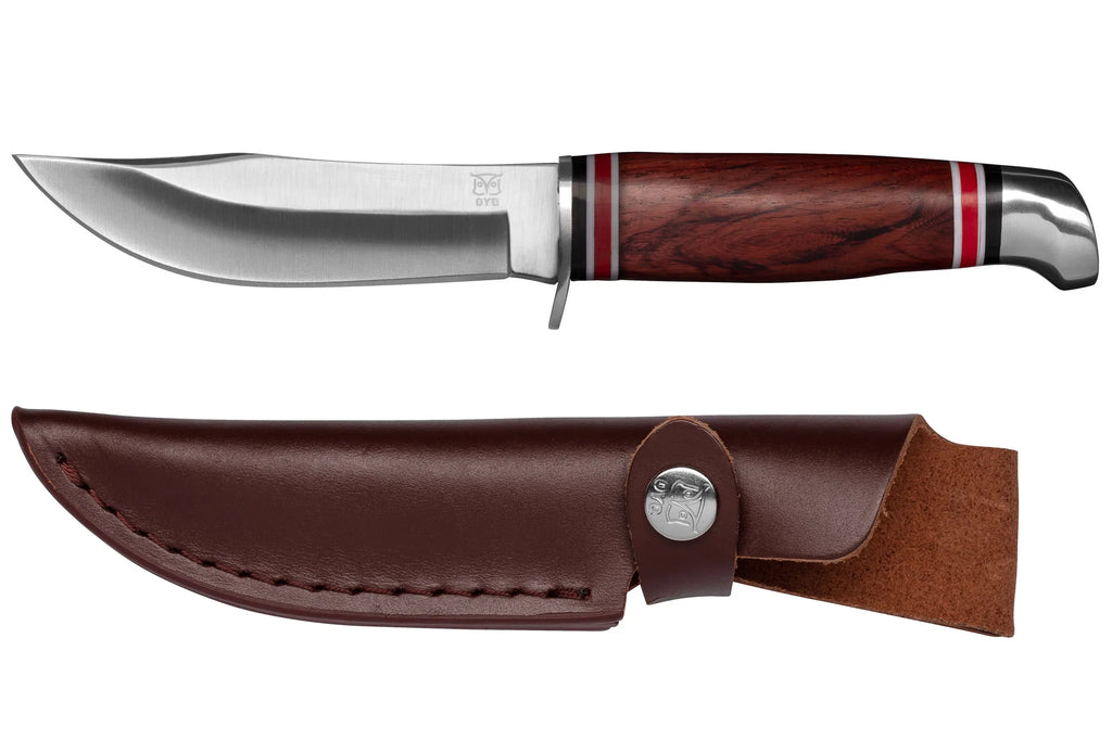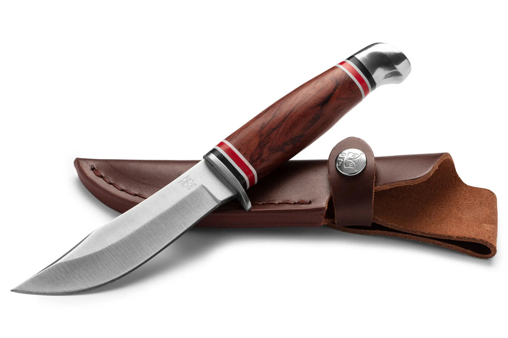 Het ergonomisch gevormde handvat van rozenhout biedt een stevige, comfortabele grip en geeft het mes een luxe uitstraling. Het Geilo jachtmes wordt geleverd in een stijlvolle Øyo geschenkverpakking en een lederen holster, zodat je het veilig en gemakkelijk kunt dragen. Een bijzonder cadeau voor iedere outdoorliefhebber!