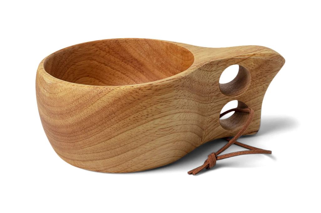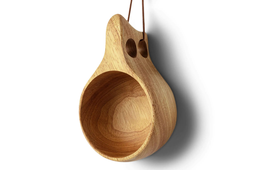 Gemaakt van slijtvast rubberhout en afgewerkt met een leren koord, waardoor de mok zowel duurzaam als stijlvol is.