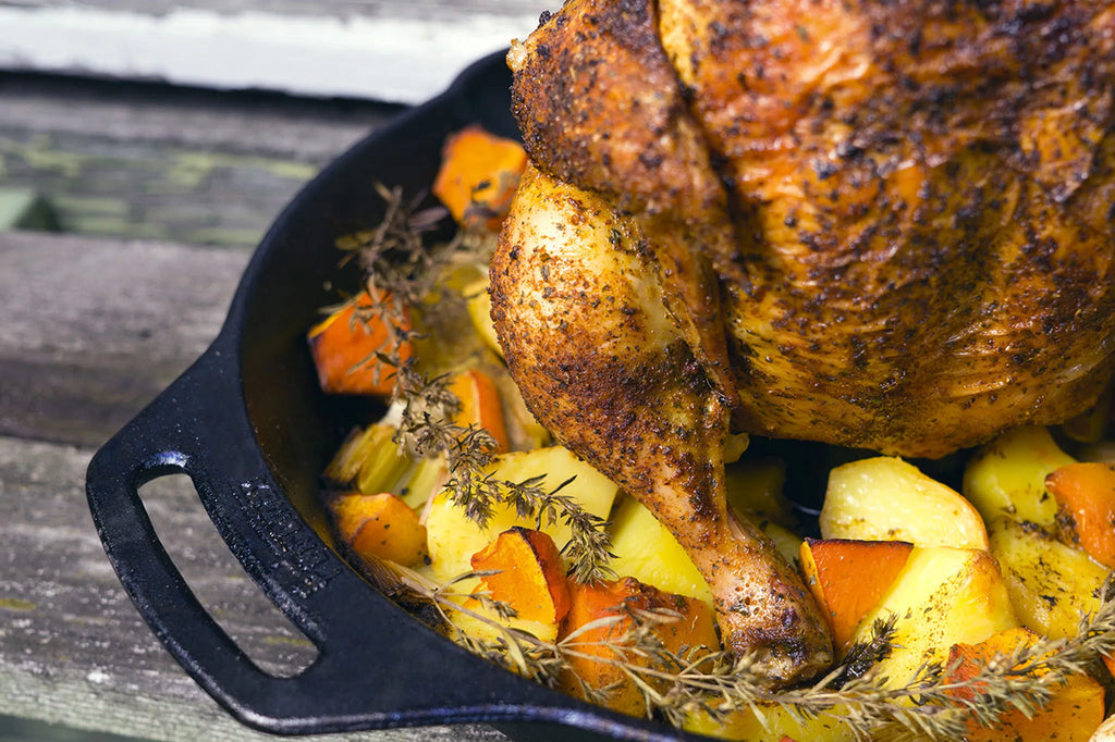 Met de Petromax gevogelte braadpan cf30 bereid je kip, kwartel of een kleine kalkoen eenvoudig en gelijkmatig. Het gevogelte wordt rechtop geplaatst op de gietijzeren braadpan, waardoor de warmte optimaal wordt verdeeld en het vlees heerlijk sappig blijft.