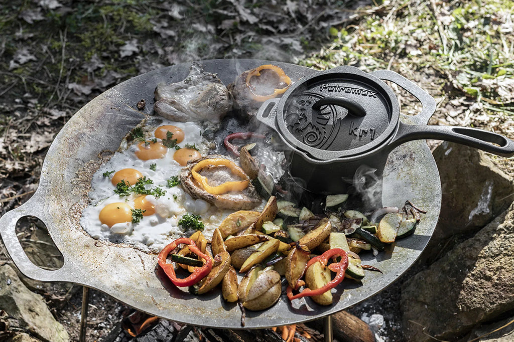 De steelpan heeft een platte bodem en een stevig handvat, waardoor hij stabiel staat op het fornuis en gemakkelijk te hanteren is boven open vuur. Het massieve gietijzer zorgt voor een uitstekende warmteverdeling en langdurige warmteopslag.