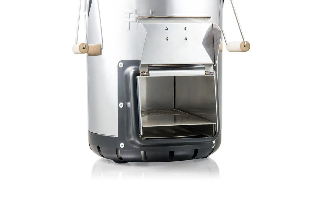 De optimale luchttoevoer wordt mogelijk gemaakt door het slimme L-vormige ontwerp van de brandstofinvoer, verbrandingskamer en schoorsteenopening. Hout, takken, dennenappels en ander natuurlijk brandmateriaal voeg je eenvoudig toe via de praktische invoeropening, zodat je het vuur nauwkeurig kunt regelen.