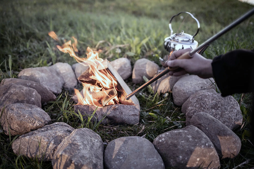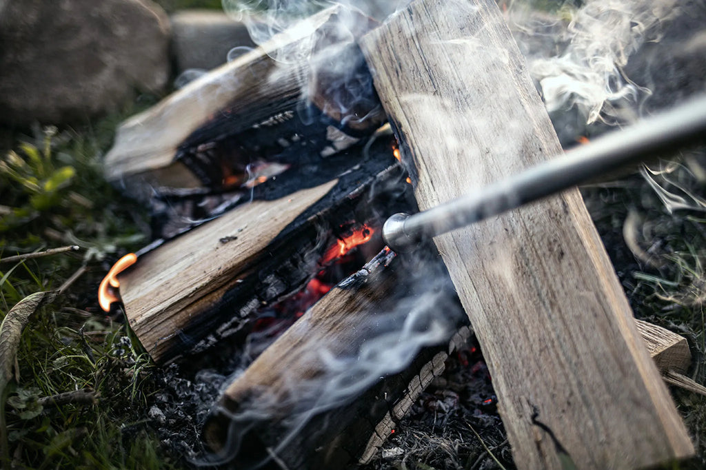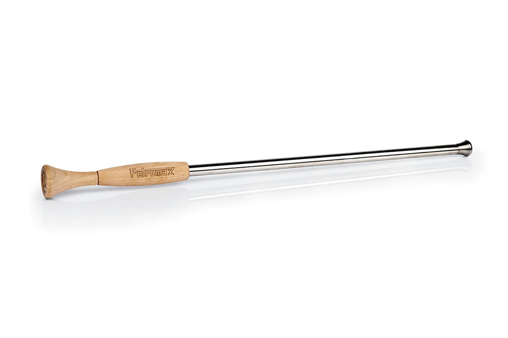 Schuif de blaaspijp volledig uit tot de maximale lengte. Richt het uiteinde op de plek waar je extra lucht wilt toevoegen en blaas krachtig via het houten mondstuk. Het vuur krijgt direct een gecontroleerde impuls, zonder dat je dicht bij de hitte hoeft te komen.
