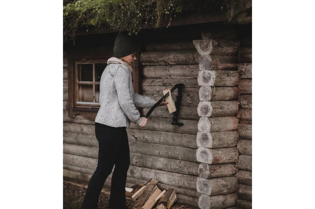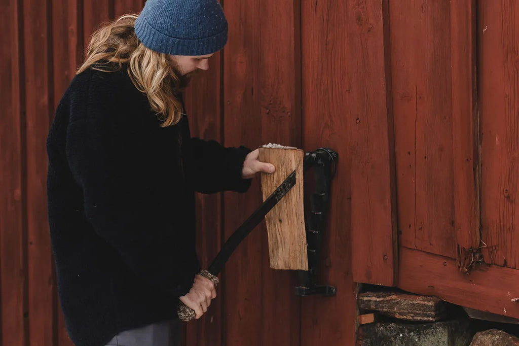Je bedient het mes met één hand, terwijl je met de andere hand het hout stevig vasthoudt. Zo blijft het hout stabiel en wordt het risico op ongelukken tot een minimum beperkt. In tegenstelling tot het hakken met een bijl is deze manier van kloven niet alleen veiliger, maar ook gecontroleerder en prettiger in gebruik.