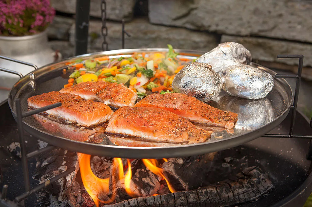 Grote roestvrijstalen bakplaat voor op de Bålpanne Odin of op een BBQ. Een RVS bakplaat waar je de meest verrukkelijke gerechten op kunt bakken. Bijvoorbeeld pannenkoeken, eieren met spek, vis, uien, champignons of aardappelen. De bakplaat is 60 cm in diameter en kan op het grillrooster van de Bålpanne geplaatst worden.