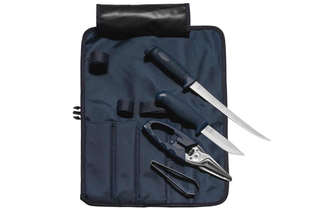 De set bestaat uit een fileermes, tongmes, visschaar en visgratenpincet. Alles is netjes opgeborgen in een stevige Cordura foedraal die bescherming en overzicht biedt, ideaal voor onderweg of op het aanrecht. De ergonomische handgrepen zijn gemaakt van tweecomponenten kunststof zonder openingen, zodat er geen bacteriën kunnen ophopen. Dat maakt deze set niet alleen praktisch, maar ook hygiënisch en duurzaam.